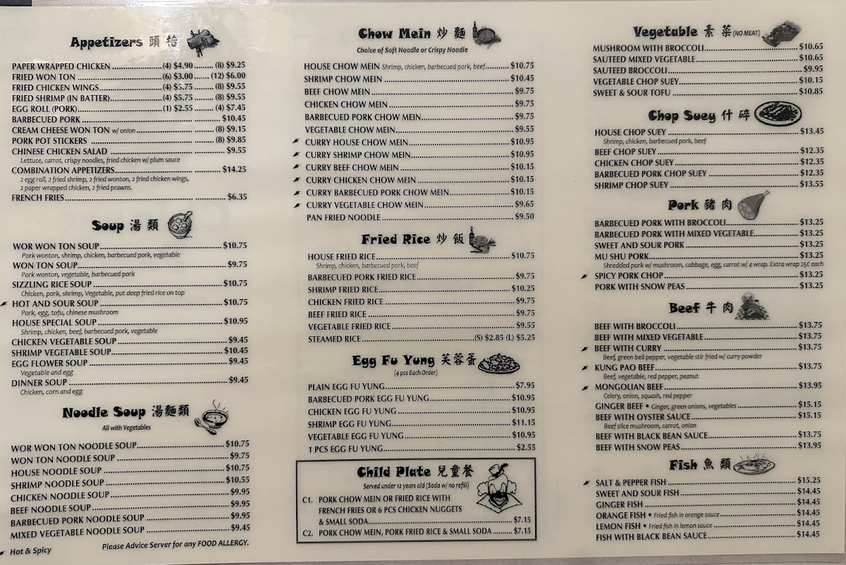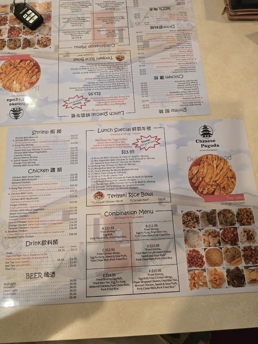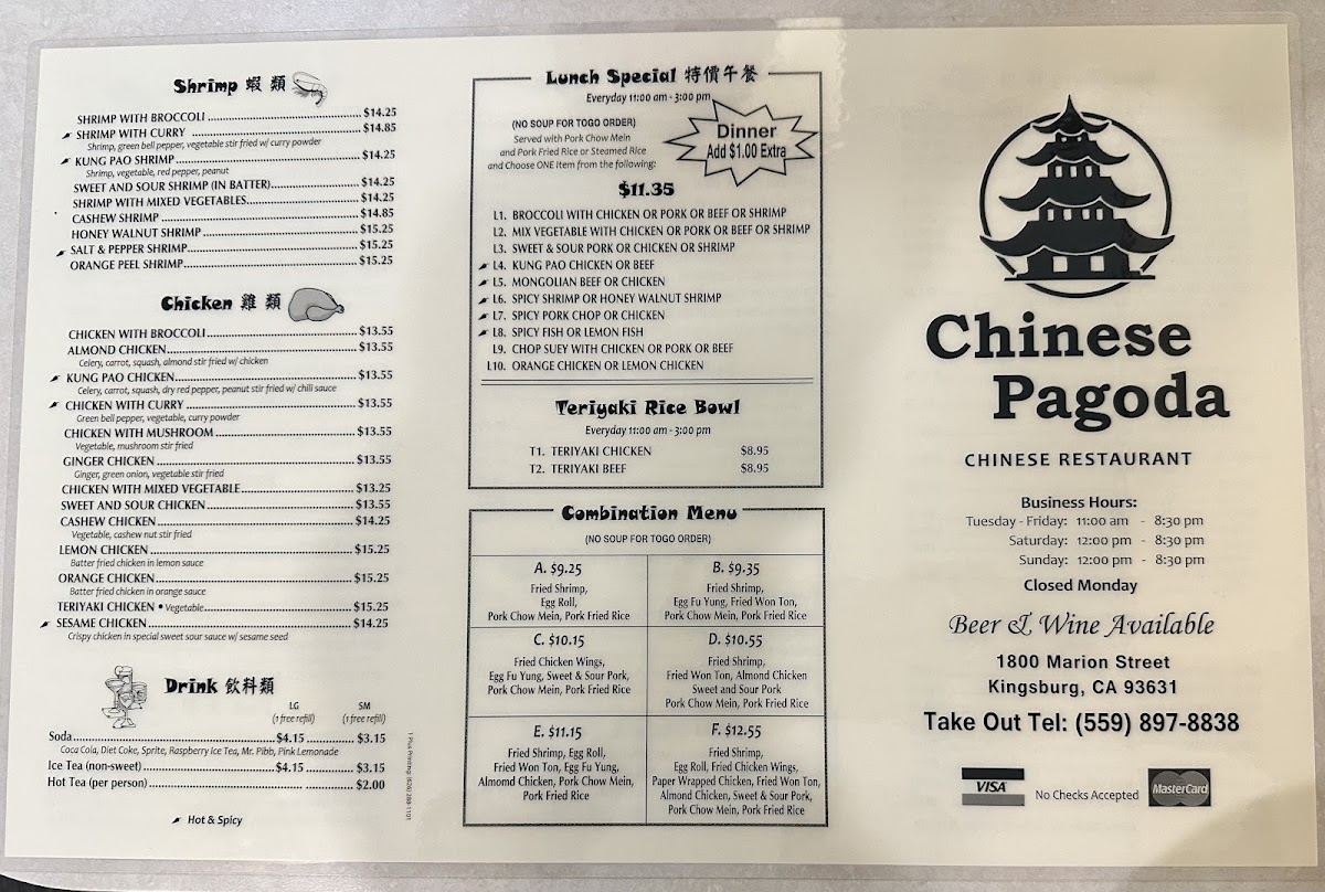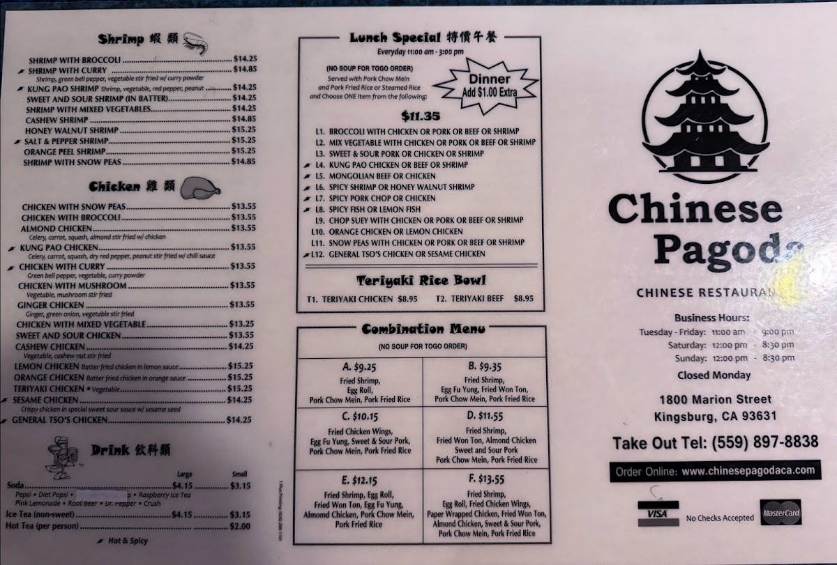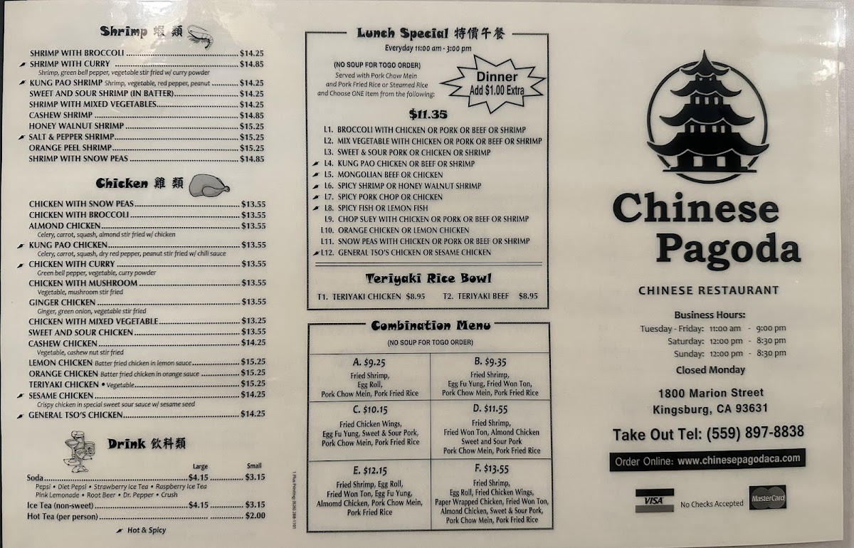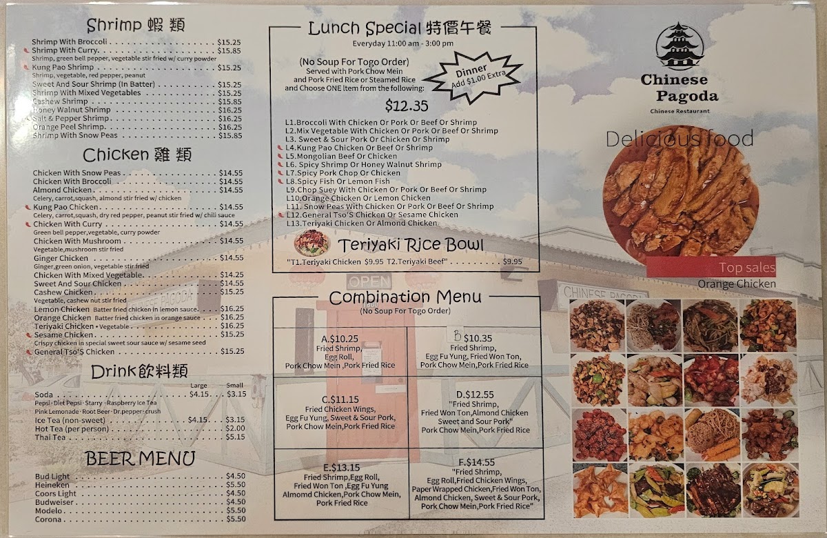 From a reviewer’s perspective, the menu at Chinese Pagoda Restaurant offers a broad and satisfying selection of classic Chinese-American dishes, with highlights like the flavorful Teriyaki Chicken Bowl and Teriyaki Beef Bowl setting a strong tone. Popular staples such as Kung Pao Chicken, Almond Chicken, and Mongolian Beef showcase well-balanced seasoning, while pork options like Mu Shu Pork and Spicy Pork Chop add variety. The soup selection, including Hot And Sour Soup and House Special Soup, provides comforting starters, and appetizers like Fried Chicken Wings and Pork Pot Stickers (8) are perfect for sharing. Noodle and rice dishes such as Beef Chow Fun, Shrimp Fried Rice, and House Chow Fun are hearty and satisfying, while combination plates featuring items like Fried Shrimp, Egg Roll, and Almond Chicken deliver great value. Seafood lovers can enjoy dishes like Honey Walnut Shrimp and Salt & Pepper Fish, and vegetarian options such as Sautéed Broccoli and Vegetable Chop Suey round out the menu nicely. Overall, the variety and familiar flavors make the menu approachable and appealing, even without clearly listed prices.